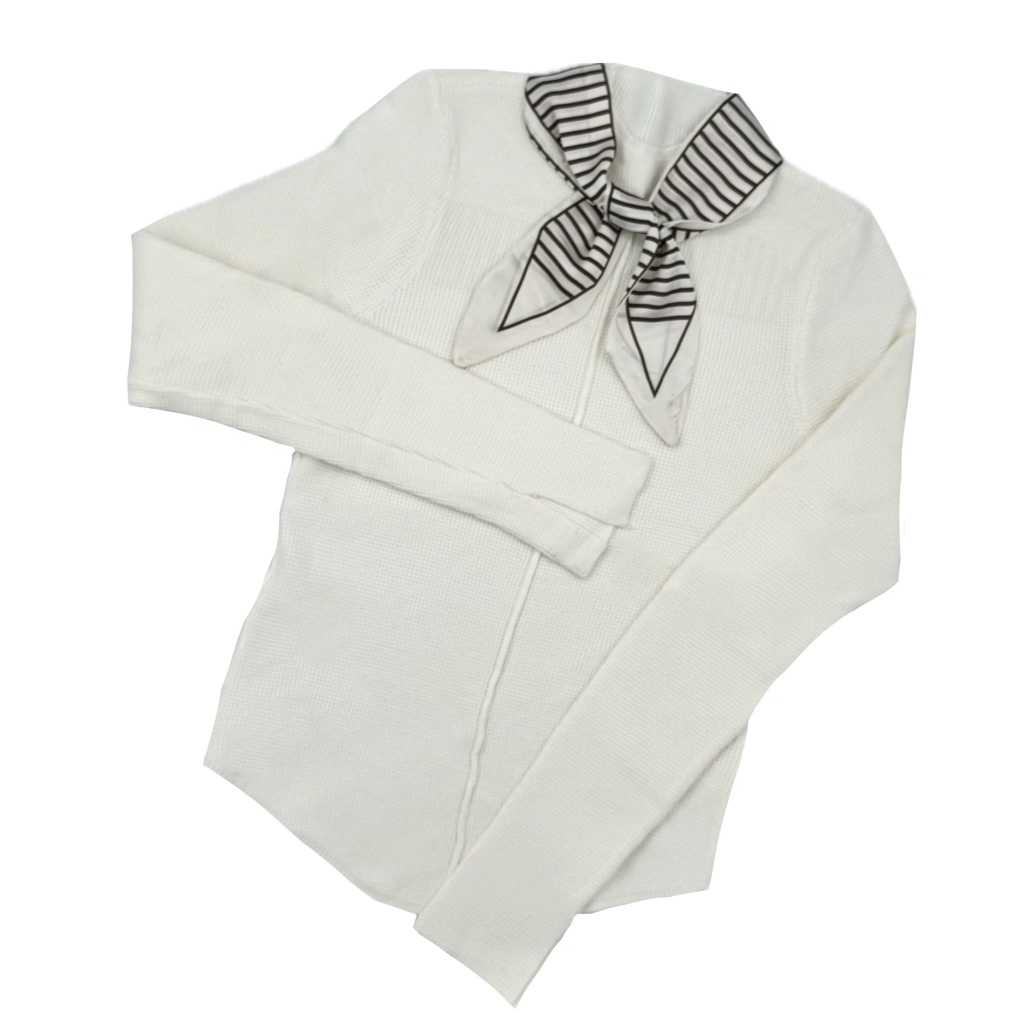 یکی از ویژگیهای جذاب این بافت، وجود دستمال گردن سفید با خطوط مشکی است که همراه آن عرضه میشود و استایل بافت را از سادگی مطلق خارج کرده و آن را شیکتر و خاصتر جلوه میدهد.