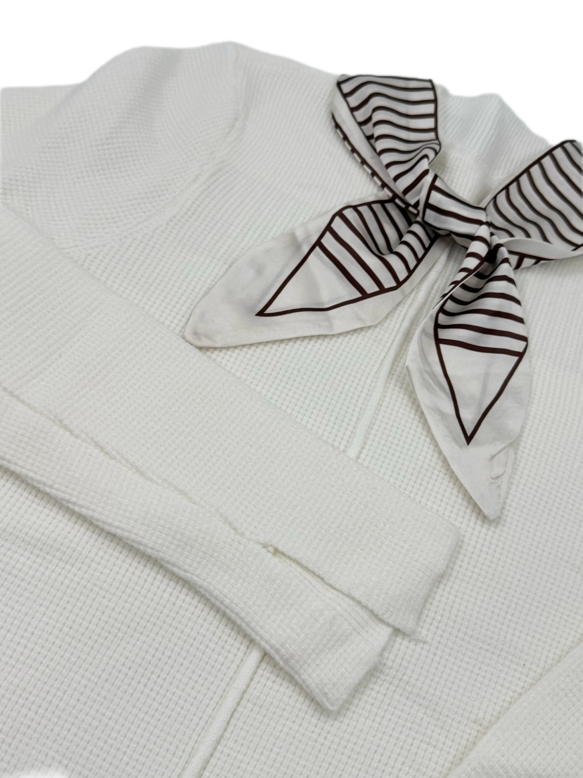 وجود دستمال گردن سفید با خطوط مشکی باعث شده این بافت ظاهری خاصتر پیدا کند.