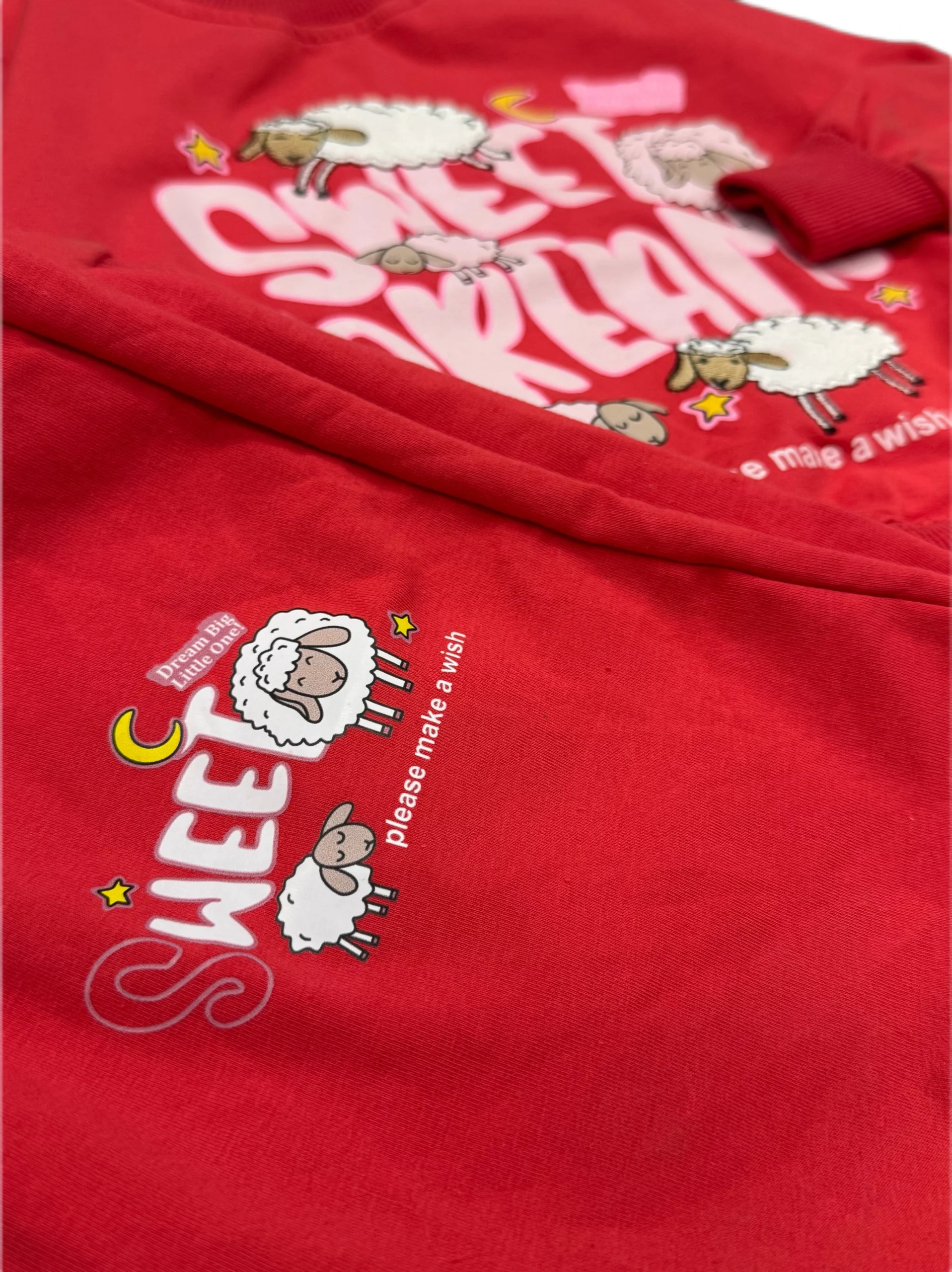 این دوتیکه دخترانه از یک بالاتنه و شلوار تشکیل شده که طراحی خاصی دارد. بالاتنه با آستینهای بلند، جلوهای لطیف و دوستداشتنی به لباس داده است. رنگهای زرد، صورتی، بنفش و قرمز به شکلی هماهنگ و چشمنواز کنار هم قرار گرفتهاند که ترکیبی شاد و دخترانه ایجاد میکند. در قسمت جلوی لباس، تصویر ببعی جذاب به همراه نوشتهی SWEET قرار دارد که حس شیرینی و لطافت را به خوبی منتقل میکند و باعث میشود کودک شما با لباسی پرانرژی و دوستداشتنی در میان جمع بدرخشد.