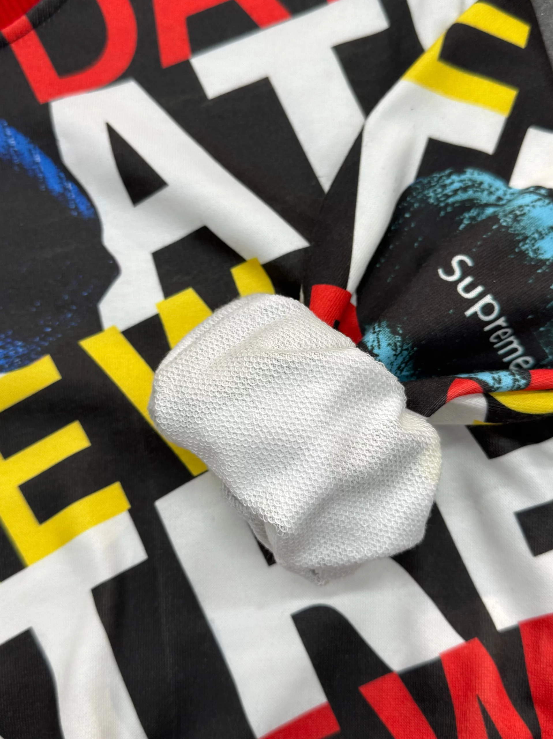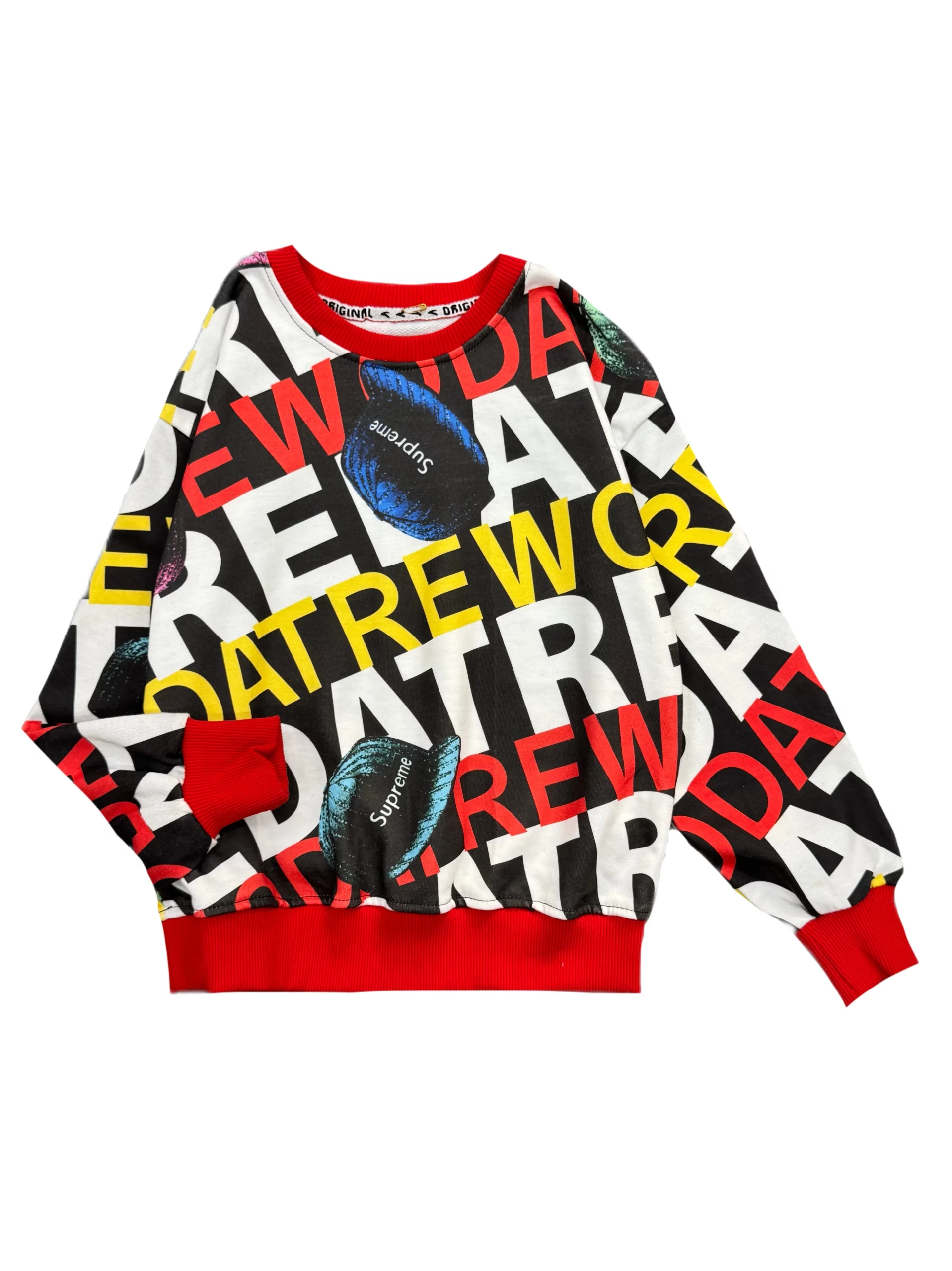 طرح روی بلوز ترکیبی از نوشتهها و رنگهای پرانرژی مثل قرمز، زرد، مشکی و سفید است که جلوهای شاد و کودکانه به لباس میدهد. رنگ قرمز در قسمت یقه و لبهها باعث شده ظاهر لباس زنده و خاصتر دیده شود.