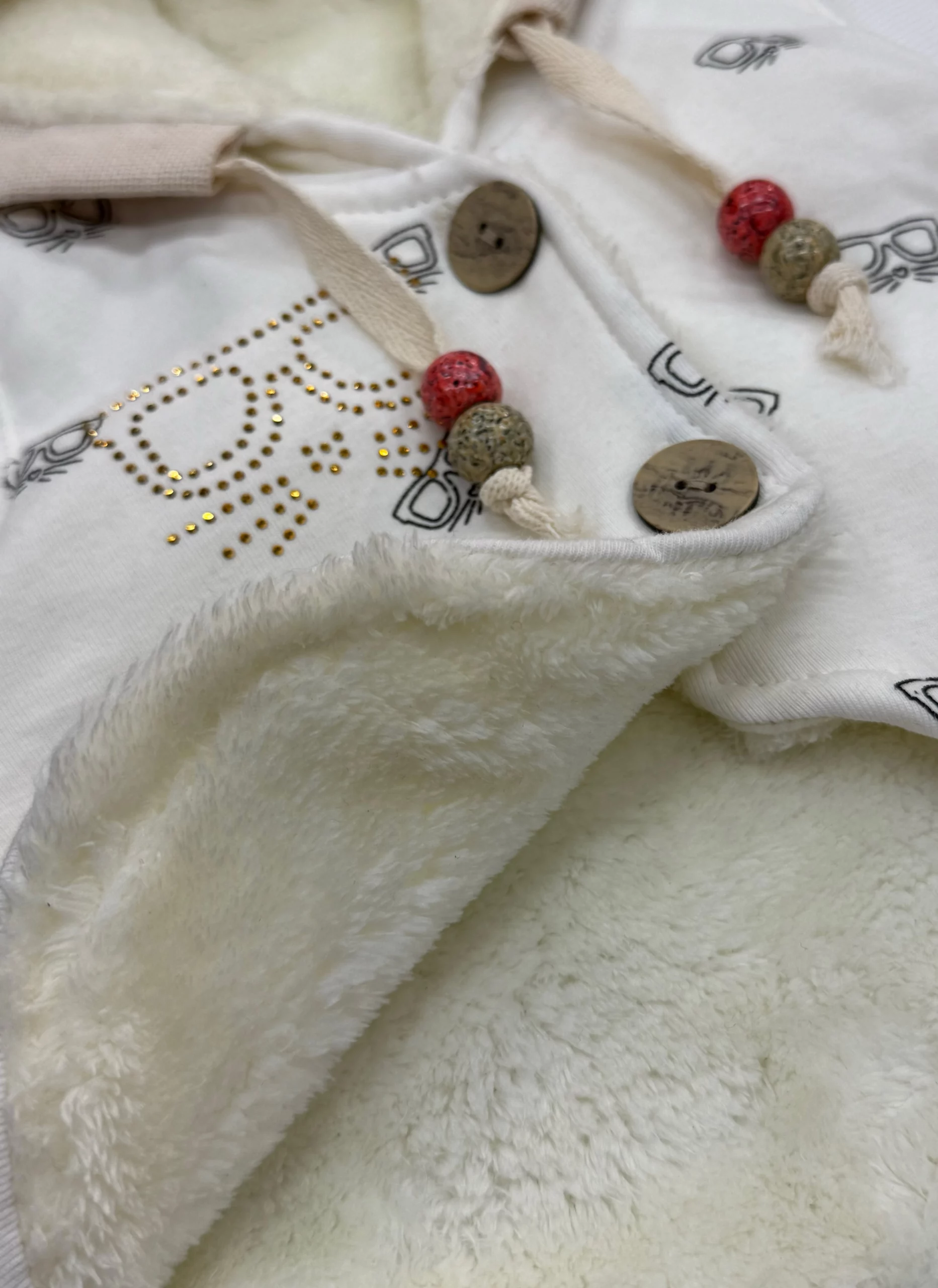 پارچهی این ست از الیاف طبیعی و پشمی ساخته شده است که علاوه بر گرما، حس لطافت فوقالعادهای به پوست کودک میدهد. آستر خزدار داخل جلیقه باعث میشود بدن کودک حتی در هوای سرد نیز گرم بماند. طراحی کلاهدار جلیقه علاوه بر ظاهر فانتزی، نقش محافظ در برابر سرما را هم ایفا میکند.