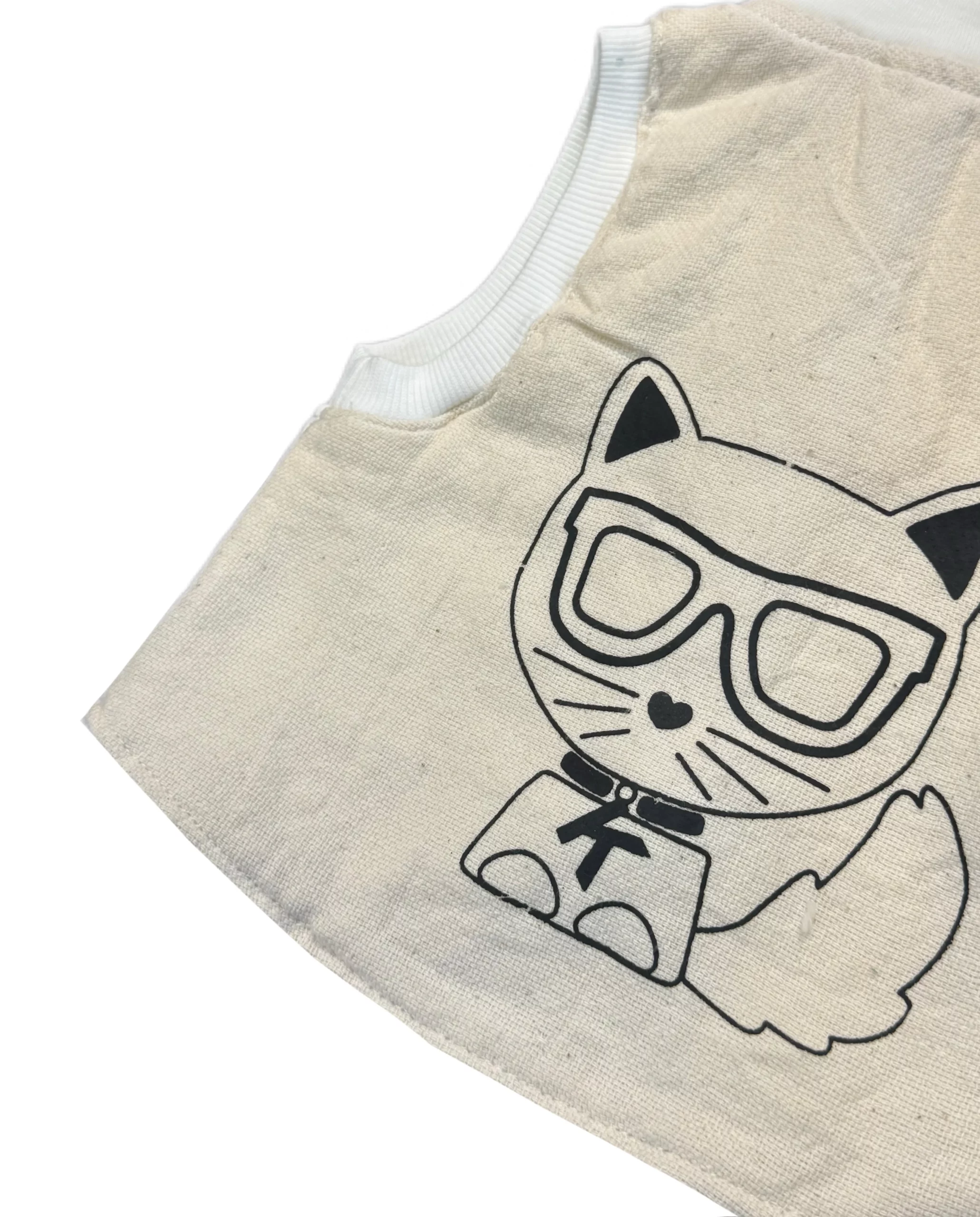 این ست با رنگهای ملایم و خنثی طراحی شده تا به راحتی با دیگر لباسهای کودک قابل ستکردن باشد. رنگ کرمی و سفیدِ کار باعث میشود ظاهر کودک همیشه تمیز، لطیف و چشمنواز به نظر برسد. جزئیات ریز مانند دکمههای چوبی و طرحهای چاپی عینک روی جلیقه، به لباس حالتی کودکانه و خاص بخشیدهاند.