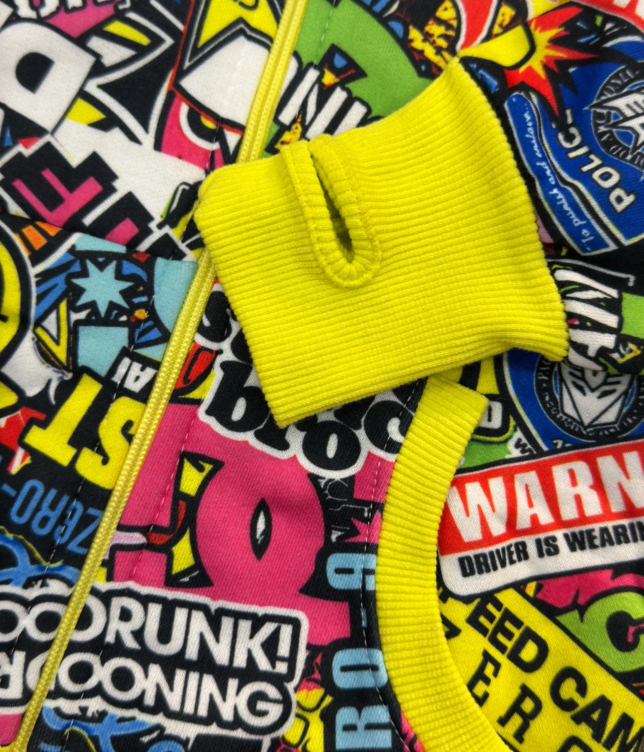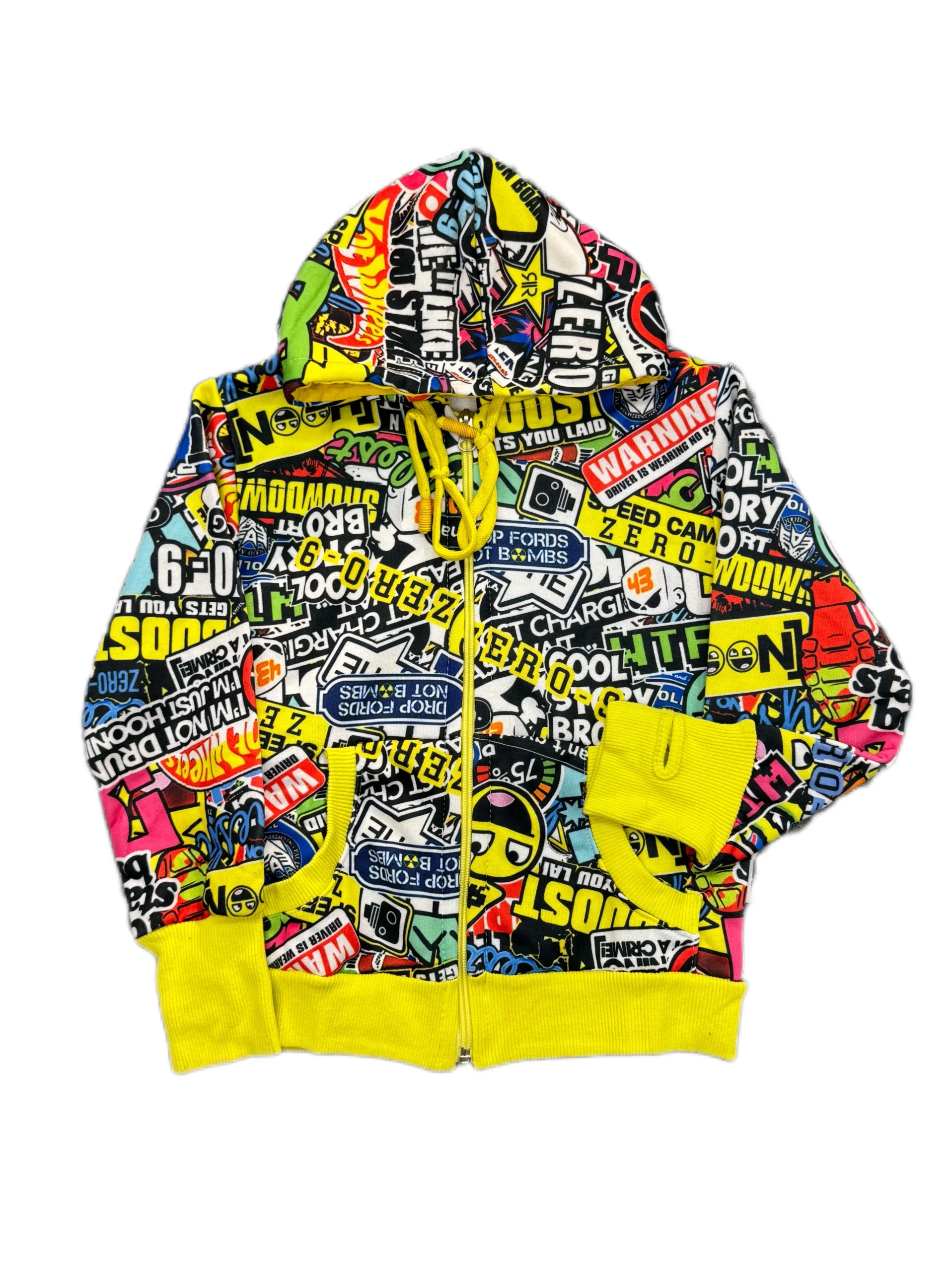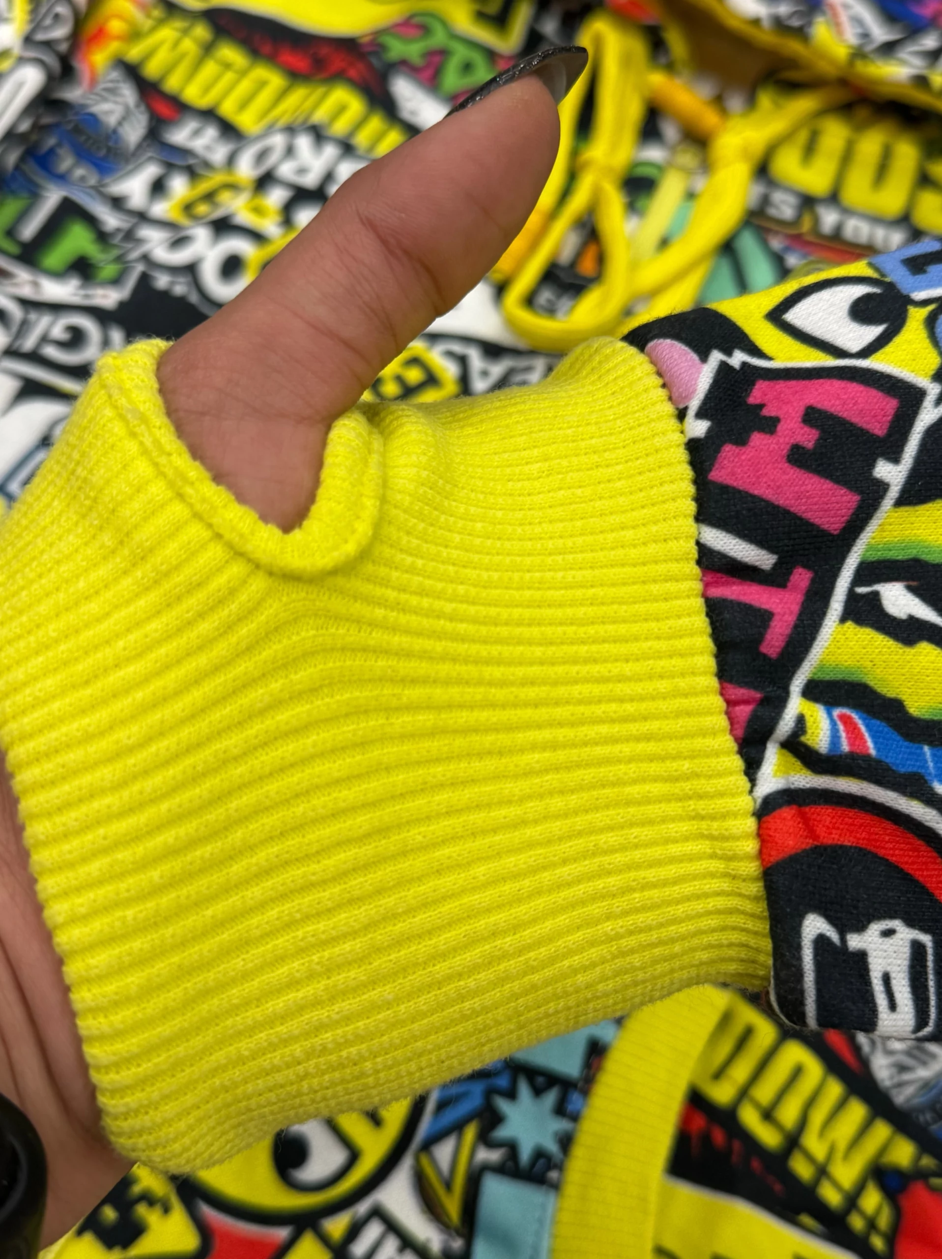 جنس این هودی از پارچه پنبهای و دورس باکیفیت است که علاوهبر دوام بالا، لطافت و راحتی بینظیری دارد. رنگ زرد روشن در لبهها، آستر کلاه و بندهای هودی باعث شده جلوهای خاص به آن داده شود و با طرحهای رنگی روی پارچه ترکیب چشمنوازی ایجاد کند.
