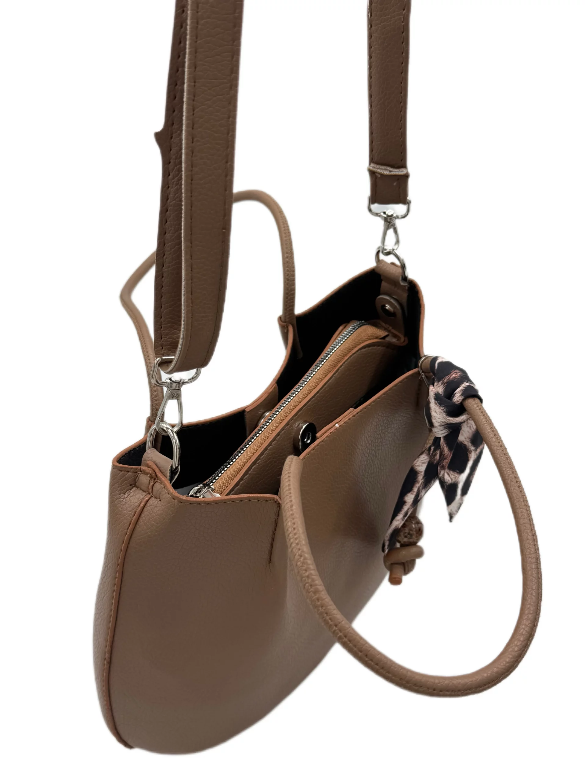 این کیف علاوه بر ظاهر زیبا، طراحی بسیار حرفهای دارد؛ دارای یک زیپ مرکزی، دو جای کناری، کیفیت بالا و سایز مناسب است. رنگ قهوهای آن با هر استایلی ست میشود و بند پلنگیاش جذابیت کیف را چند برابر کرده است.